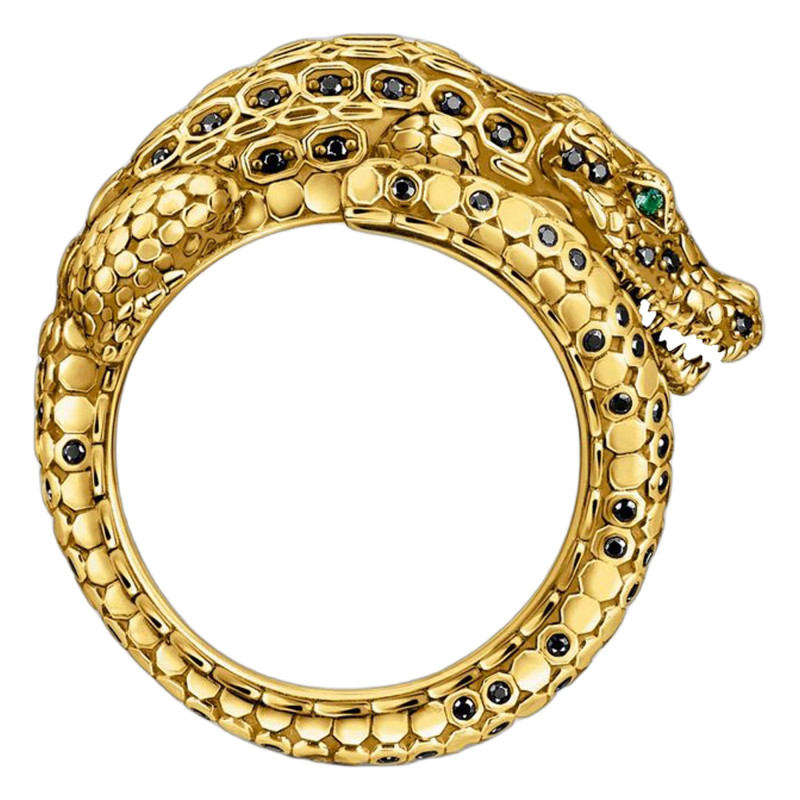 Découvrez la Bague Crocodile en Argent 925 Plaqué Or Jaune 750, parsemée de Pierres Noires et d'accents verts. L'alliance parfaite entre force et délicatesse, cette bague est un hommage à la majesté sauvage. Le Plaqué Or 750/1000 (18K) magnifie l'argent massif 925/1000, subtilement satinée pour une allure mate chic. Avec une largeur de 28,00 mm, une épaisseur de 5,00 mm, et une hauteur de 15,00 mm, cette pièce captivante évoque des récits d'aventures exotiques et mystérieuses à chaque regard. Le serti, un mélange de Serti Massé et Serti à Grains, magnifie les gemmes vitro-céramiques vertes et l'oxyde de zirconium noir, telle une constellation sur une peau reptilienne.